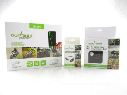 The Durabatt DB-100 Portable Jump Charger COMPLETE Charging Package. Everywhere you want to go...be ready! Jump starter, super bright built in LED flashlight, recharge your smart phone, portable computers and USB devices. Your new package also includes the DB-CLA Auxiliary Plug for extra charging capabilities; and the DB-COMP Mini Air Compressor for your stay at the lake or for extra ATV tire pressure on your way there.
