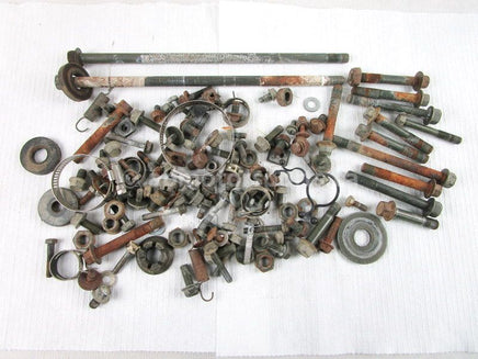 A USED assortment of nuts, bolts and washers which includes miscellaneous body and frame hardware from a 2000 Yamaha Kodiak 400 may not be a complete set.